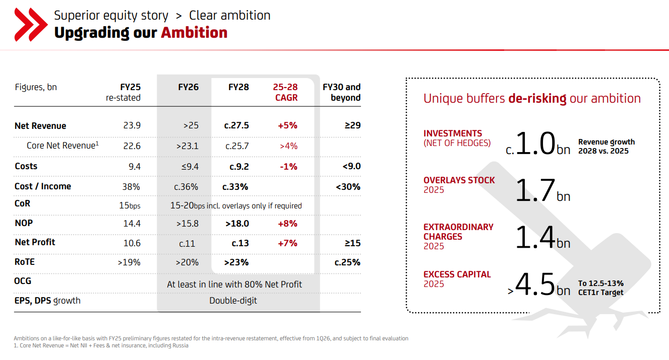Focused on growing revenues profitably faster than peers, strengthening capital‑light engines and increasing the weight of Fees & Net Insurance toward ~38% of Net Revenue. It targets Net Revenue CAGR ~5% to ~€27.5bn by 2028, moving above €29bn by 2030.