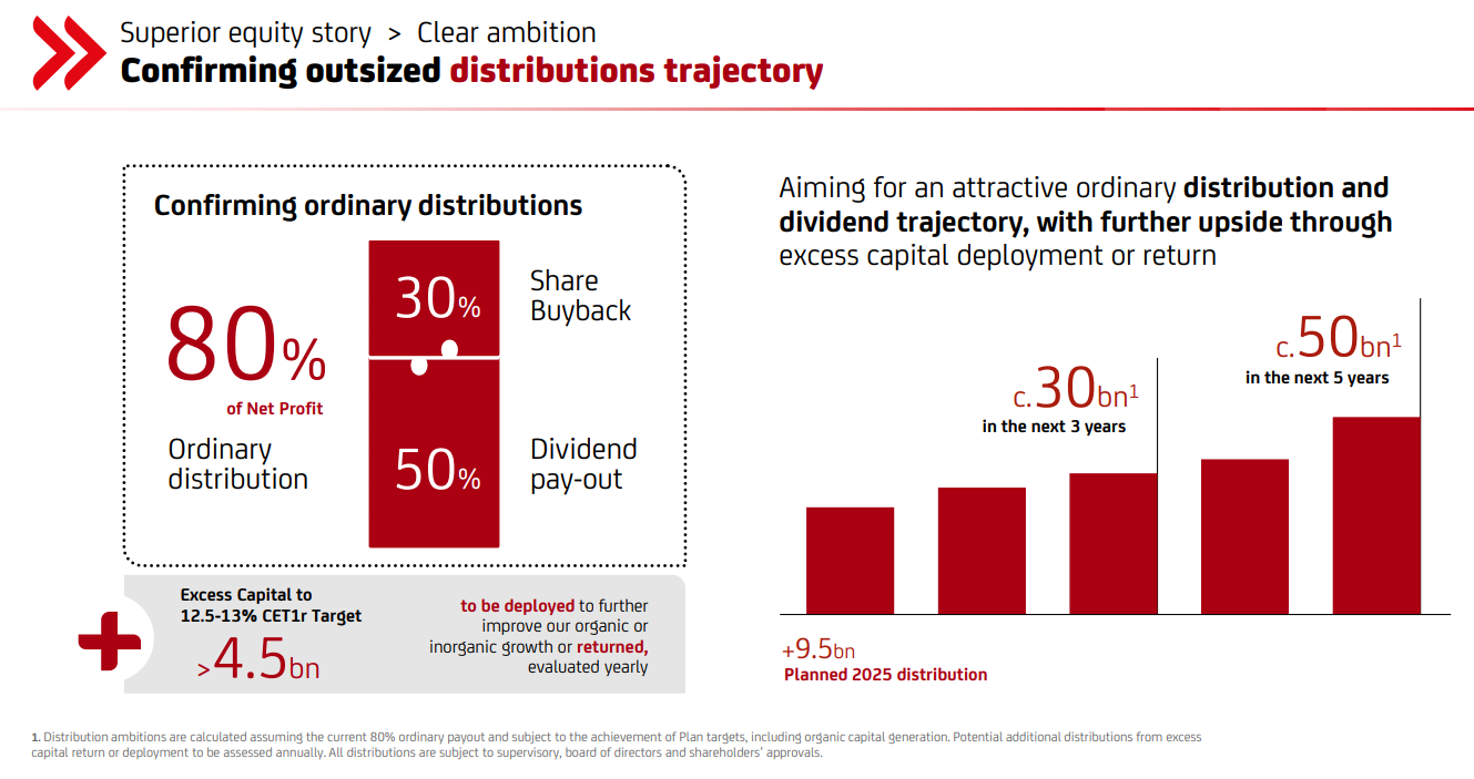 Supported by strong buffers: >€4.5bn excess capital, €1.7bn overlays and a rising capital‑light mix.